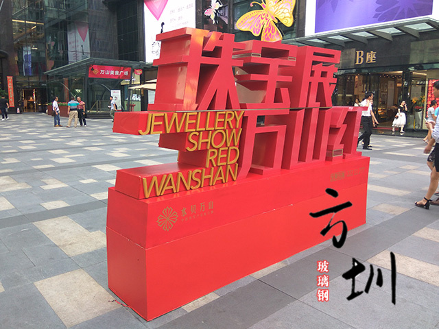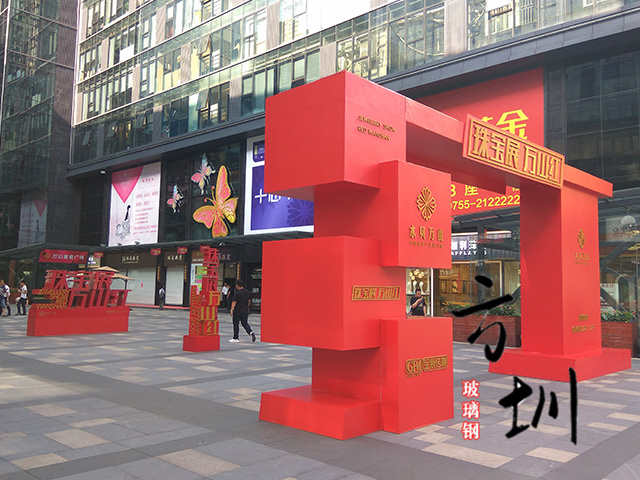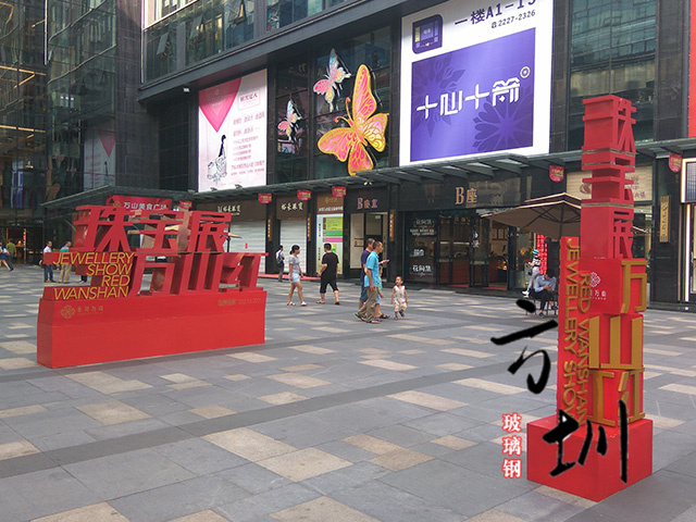 步行街玻璃钢珠宝展美陈主要通过它的玻璃钢材料、造型、颜色三方面来体现艺术设计理念。是为了某种特定的需要,通过艺术创造,公开而广泛地向公众宣传。美陈设计是艺术家帮助企业占领市场、推销产品、树立品牌、扩大知名度的重要形式,主要目的是扩大经济效益。