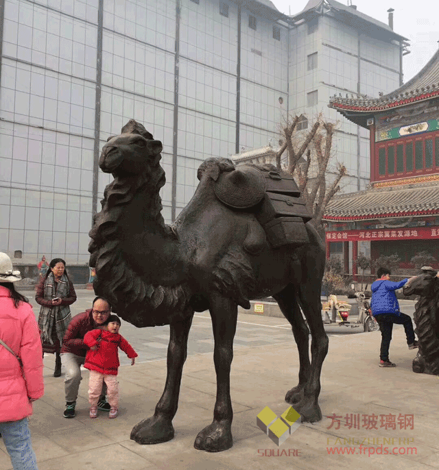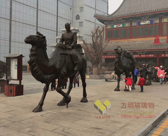 甘肃兰州一商场为了迎接其开业庆典,特地委托欣方圳制作了一组玻璃钢动物雕塑,雕塑描绘的是中国人身骑骆驼,携带货物,一路前行的样子。雕塑中的骆驼雄壮伟岸,或直立、或蹲下、或趴伏,神态万千,惟妙惟肖。骑在骆驼上的人孔武有力,顾盼神飞,形象的表现出了人物积极探索,不惧艰难,勇往直前的形象。