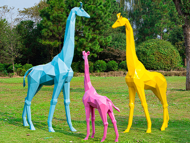 切面长颈鹿雕塑,就是指身体造型以切面拼接的方式制作的长颈鹿雕塑,这种造型的雕塑和传统的具象雕塑相比,成本更低,在视觉上却比具象雕塑更具冲击力,性价比很高。玻璃钢切面长颈鹿雕塑多数位于室外,比如广场、花坛、林荫道上、山坡、草地、池畔等。
