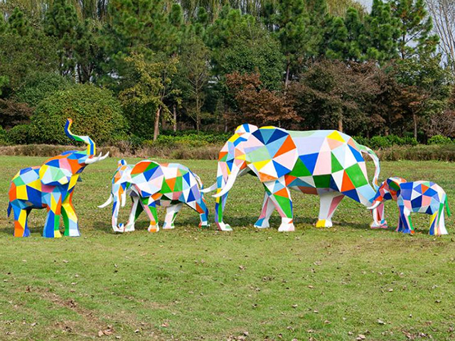 大象作为吉祥如意的象征,被广泛应用于雕刻之中,玻璃钢几何切面大象雕塑就是顺应切面造型日益流行的趋势而制作出来的,在保持大象本身造型不变的前提下,通过几何切面的形式使其抽象化,从而使得其更加前卫,让人看了眼前一亮。