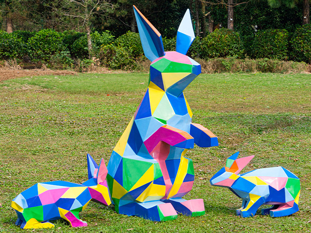 兔是机敏和幸运的象征,将兔子的造型和时下正流行的几何切面创意结合起来制作的切面兔子雕塑,在保留了兔子主要特征的同时,对兔子的外观进行了抽象化的加工,棱角分明的线条将兔子表面分割成一个个不同的切面,全新的造型令人过目难忘。