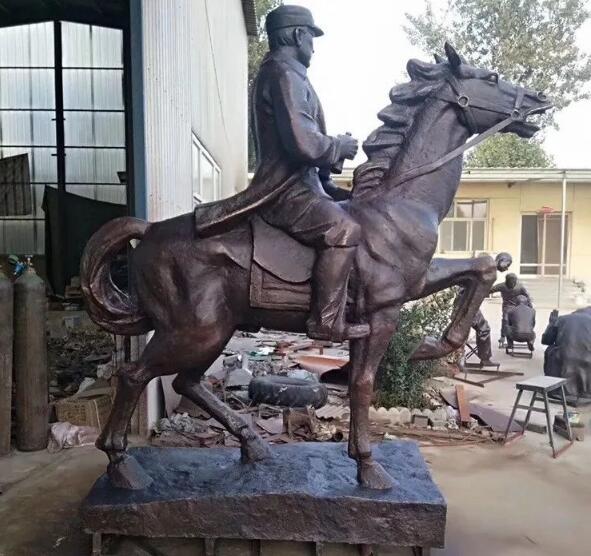 古代将军骑马造型的雕塑很有气势,看上去英姿飒爽,异常勇猛,这类雕塑中的马一般两个前蹄抬起,将军骑在马上弯弓搭箭或者是手持,将其纵马拼杀的一瞬间定格,化的表现出了将军的威武与气势。此类雕塑用的最多的材料就是铜和玻璃钢,和玻璃钢想比,虽然铸铜的造价比玻璃钢高很多,但是其使用寿命是很长的,用几十年都没有问题,玻璃钢材质虽然便宜,但是使用的时间有限,一般用几年就会开裂和掉色,客户可以根据自己的预算来选择使用哪种材质。