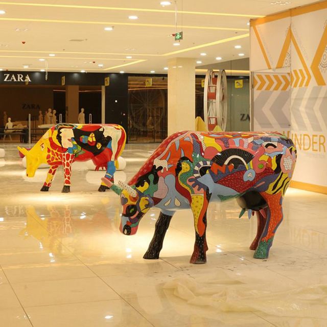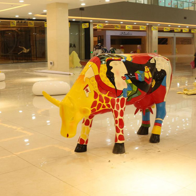 商场动物彩绘牛玻璃钢雕塑是一种雕塑成品类型,包括人物、动物、花草等多种表现形式。雕塑一般分为圆雕和浮雕两种类型,简单来 说,圆雕产品就是三维立体类雕塑(比如仿真人雕塑),而浮雕则为部分雕塑(如校园墙体雕塑)