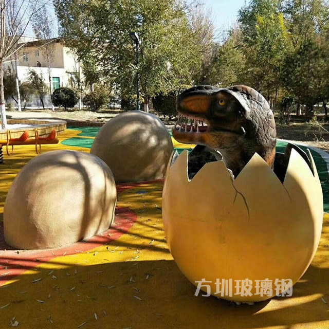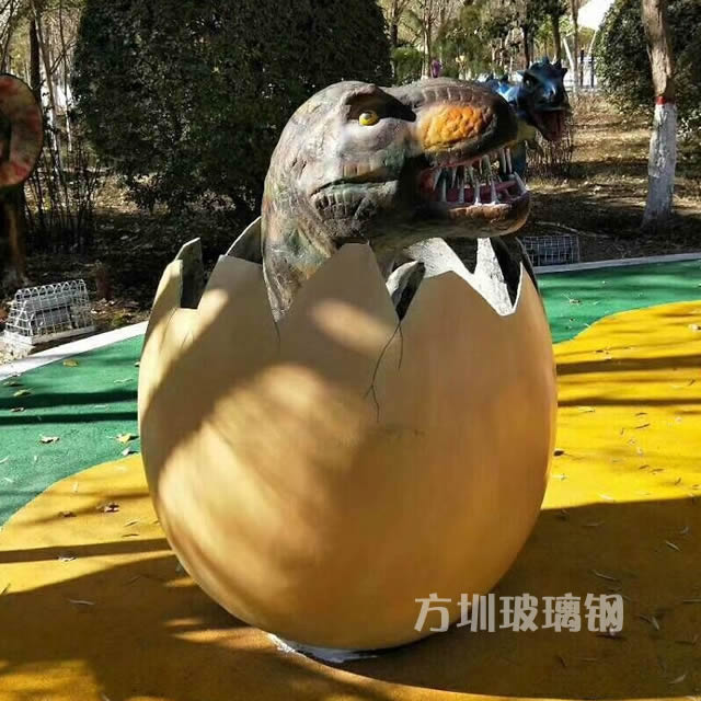 动物园恐龙蛋玻璃钢雕塑特性:具有可塑性强(只要您想的出造型,玻璃钢就能做出成品),相对来说易成型、质轻,强度高,耐腐蚀,相对来说成本相对较低、表面效果多样等特点。