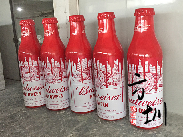 玻璃钢啤酒瓶雕塑模型型号为ZX243,高约1.7米;玻璃钢面具型号为ZX241,宽0.45米,高0.64,方圳严格按甲方提供的酒瓶模型图纸尺寸制造,采用高密度雕塑泡沫资料造型打样,采用高品质玻璃钢复合制造而成,承认样品后用196#不饱和树脂及白金玻璃纤维布生产制造毛坯,毛坯出来后经过打磨、用原子灰修补产品针孔及合模线、抛光、喷底漆、喷面漆、喷轿车专用漆,四层喷涂后表面做啤酒品牌信息彩绘效果,这样造型精巧,高端大气的品牌玻璃钢啤酒瓶模型就出炉了。与定制的玻璃钢面具、蝙蝠侠翅膀,为该品牌节日庆典品牌文化庆典活动展览添彩。