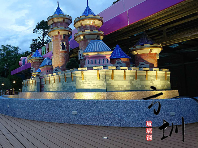 景区玻璃钢宫殿城堡表面做多色彩绘效果,采用196优质树脂+玻璃纤维白金布增强材料等复合而成,景区风格的玻璃钢城堡宫殿吸引和引导游客出入,提升景区特色项目的整体形象。