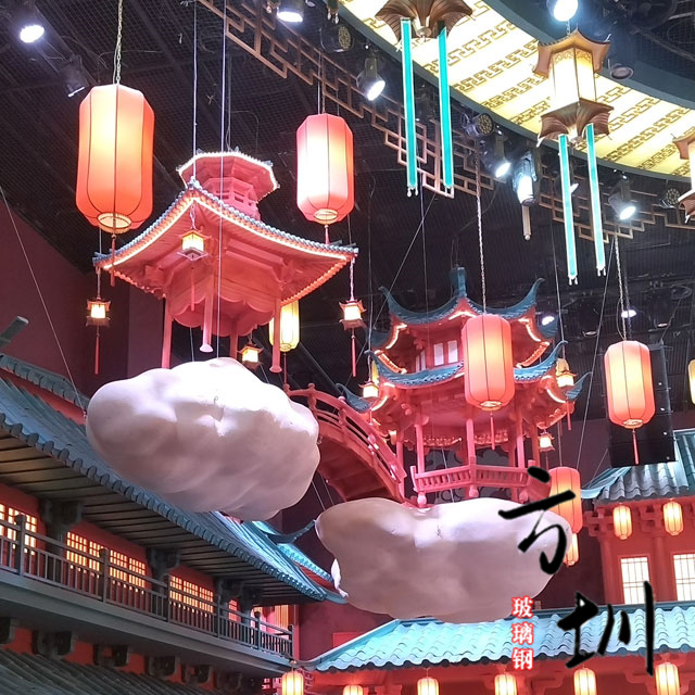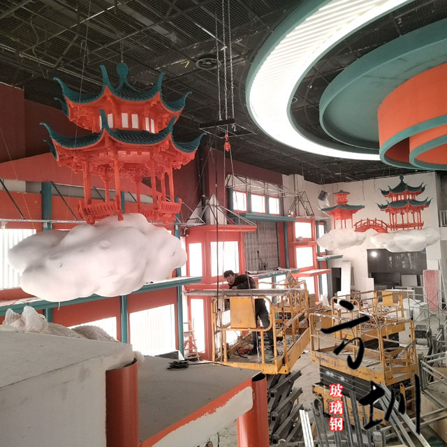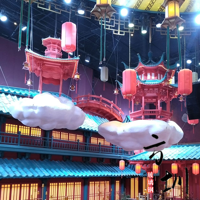 玻璃钢云朵凉亭可以通过喷涂、彩绘等工艺,呈现出丰富多样的色彩。在安徽合肥中式婚庆宴会厅中,可以选择红色、金色、粉色等喜庆的颜色,为婚礼增添一份温馨与浪漫。